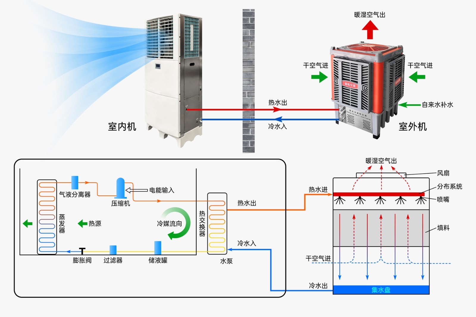 ? 蒸發冷:外機水簾蒸發吸熱→預冷循環水→再進壓縮機→壓縮機負載降30%-50%