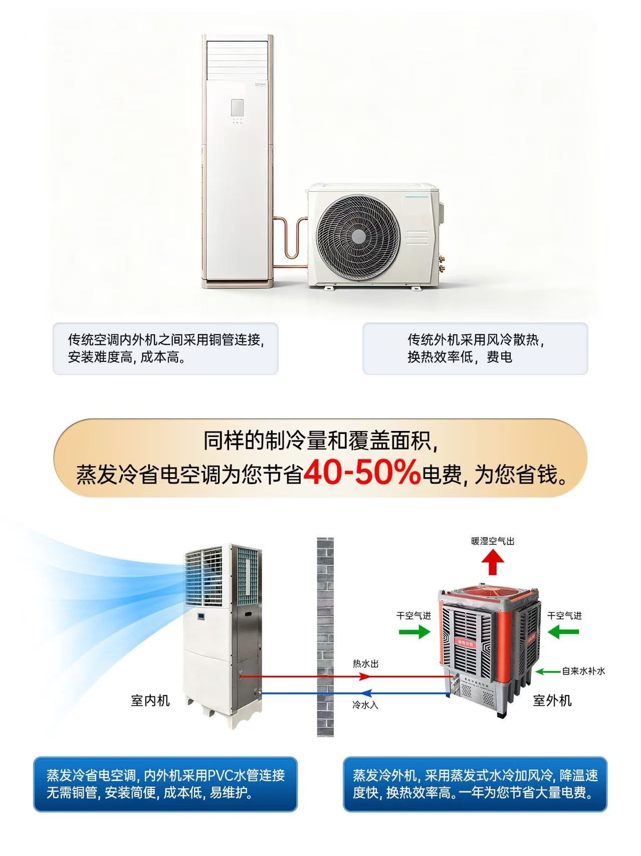 ? 蒸發冷:PVC水管連接,不用銅管;安裝快、無冷媒泄漏風險